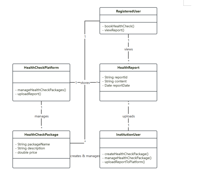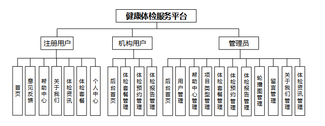 平台主要包括用户端、机构端和管理员端三个部分。用户端提供体检套餐浏览、预约、报告查询、健康资讯等功能;机构端主要用于管理体检套餐、处理预约记录、上传体检报告;管理员端则负责用户管理、数据审核、报告管理等后台操作。