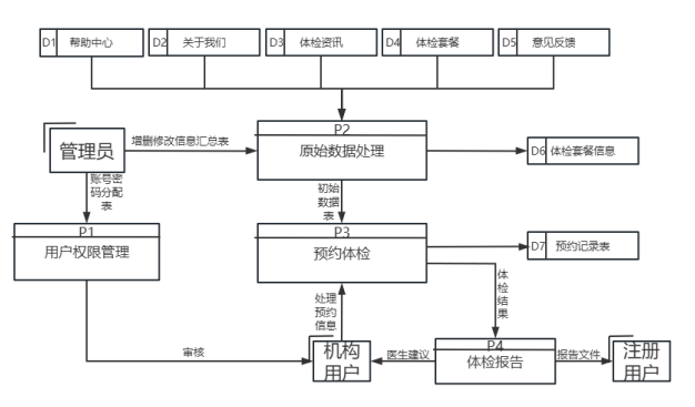 综上所述,平台应支持多方协作,满足不同用户群体的需求,提供一体化的健康管理服务,确保系统的稳定性、安全性和高效性。顶层数据流图如图3-1所示。