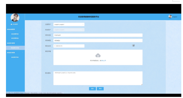 The platform aims to enhance the accessibility and convenience of medical examination services, provide users with an efficient and transparent medical examination service experience, and optimize the operation and management of medical examination institutions. Through intelligent appointment and report management, the platform not only enhances user experience, but also promotes the digital transformation of health management. It is expected that the system will effectively improve the quality and efficiency of physical examination services after promotion, and become an important tool in the field of health management.