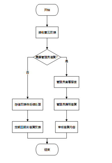 管理员可以对每条反馈进行回复,说明解决方案或进一步的处理步骤,并根据反馈内容对平台功能或服务进行优化调整。管理员回复后,系统会自动通知用户,确保用户能够及时了解反馈处理结果。流程图如下图所示。