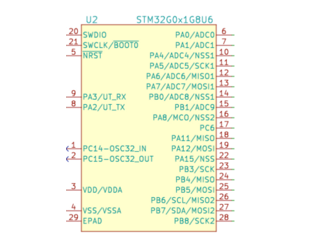 | 针脚数 | 48 | 针脚数 | 1xSPI、1xI2C、2xUSART、USB |