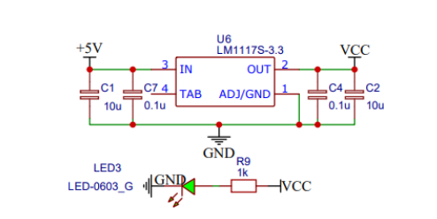 STM32_CORE单片机要求工作电压为2.0~3.6 V,而通常采用5 V的电源,因此需要使用电压转换器将5 V转换为3.6 V。选择了LM1117-3.3稳压器,这是一种低压差线性稳压器,可以产生3.3 V的输出电压。这个电路可以稳定地将5 V的输入电压转换为3.3 V的输出,适用于单片机。这个设计具有简单的绕线,平稳的运行和高可靠性。以下是电路的结构图: