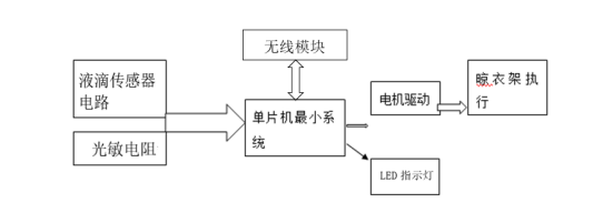 该系统采用STM32作为核心芯片,配置了液滴侦测、光敏电阻及无线模块等外围设备,实现对外界环境的监控,并向 MCU 发送相应的数据。利用单片机控制电机旋转,从而实现智能晾晒衣的功能。