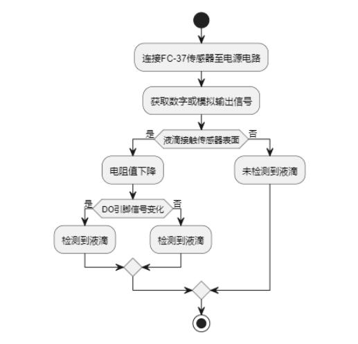 FC-37型滴状液滴传感器(也称为4.3滴液式传感器)是一种常用的用来测量液滴的方法。该传感器利用微滴的导电特性工作,当微滴接触到电极界面时,阻值就会发生变化。探测过程通常包括以下步骤: