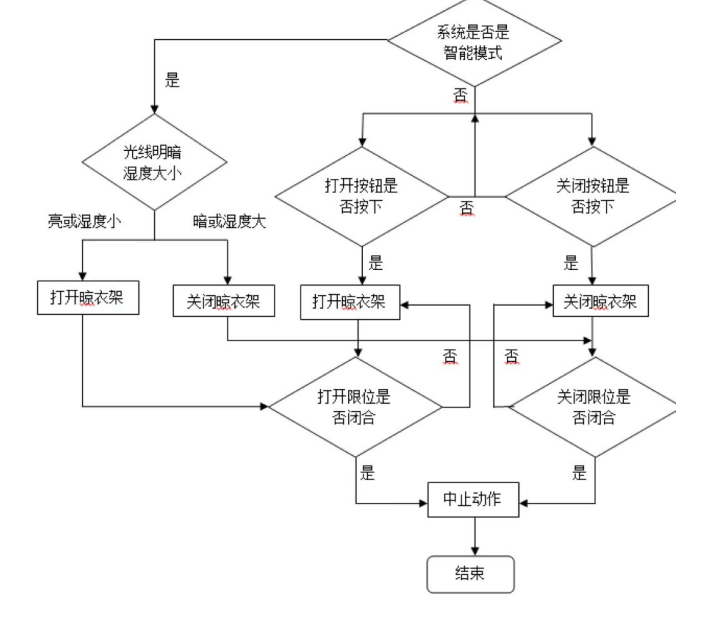 该装置的主要功能是按照用户选择的智能化或人工方式对晾衣架进行操作。在智能化状态下,装置可以感应周围的光线和湿度,当条件适宜时,会自动开启晾衣架进行烘干。相反,如果环境不适宜,装置会自动关闭晾衣架,以保护衣物不被损坏。在人工方式下,用户可以通过按键控制,如“打开”键可以提升晾衣架,而“关闭”键可以放下。此外,装置还能检测衣物的极限,确保在达到上限或下限时停止移动,以保证衣物安全。当超过极限值时,装置将停止运行,以避免事故发生。该装置结合自动化、智能化和手动操作,满足不同工况下的需求,确保安全高效。