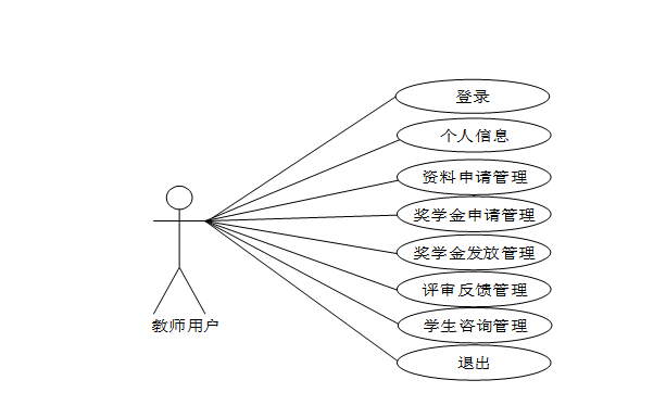 Springboot高校学生奖学金评选系统中注册教师用户包含注册、登录、个人信息、资料申请管理、奖学金申请管理、奖学金发放管理、评审反馈管理、学生咨询管理等功能模块,对应角色用例图如图3.2所示: