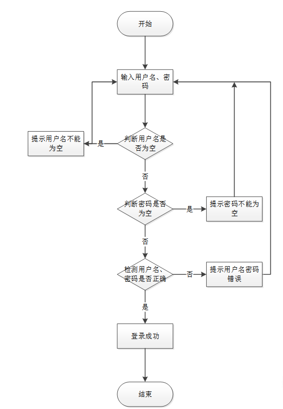 所有用户登录系统需要前端校验用户名、密码是否正确以及是否为空,具体流程图如图所示: