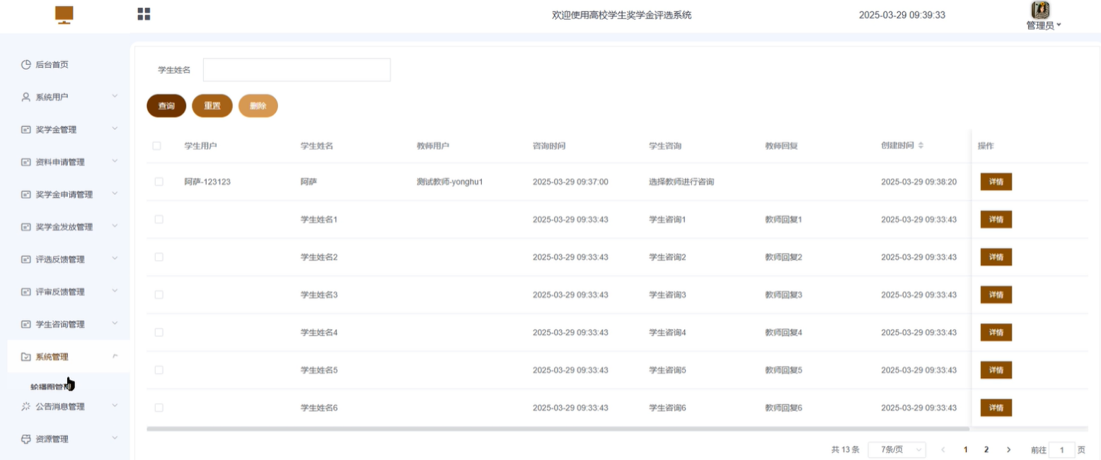 (9)学生咨询管理:包含学生咨询列表和学生咨询添加功能。学生咨询列表:展示所有的学生咨询信息,可进行增删改查等操作。学生咨询添加:可手动添加学生咨询信息。