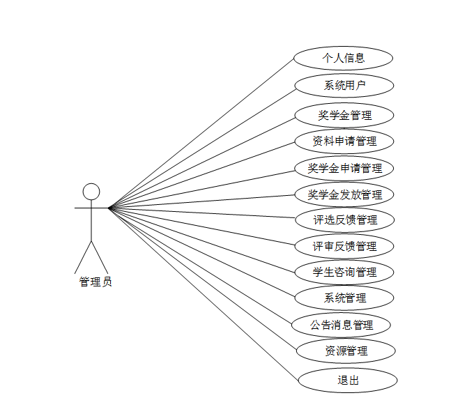 Springboot高校学生奖学金评选系统中管理员涉及系统用户、个人信息、奖学金管理、资料申请管理、奖学金申请管理、奖学金发放管理、评选反馈管理、评审反馈管理、学生咨询管理、系统管理、公告消息管理、资源管理等,管理员对应的用例图如图3.3所示: