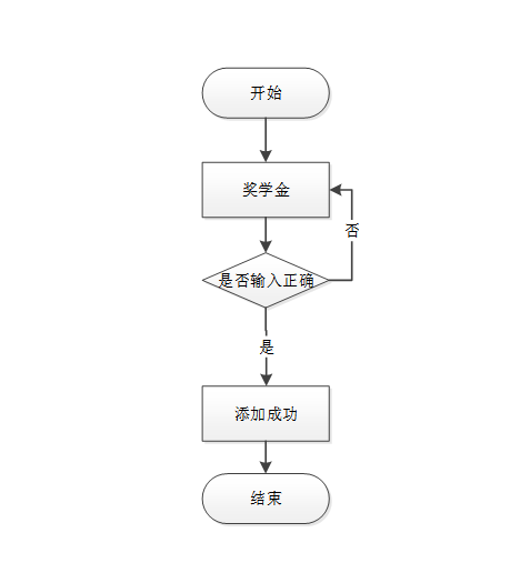 添加奖学金功能,输入奖学金名称、奖学金类型、奖学金金额等信息,并校验输入是否正确,奖学金添加流程图,如图所示: