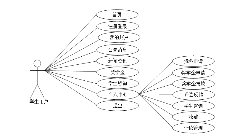 Springboot高校学生奖学金评选系统中注册学生用户包含注册、登录、首页、我的账户、新闻资讯、公告消息、奖学金、学生咨询、个人中心等功能模块,对应角色用例图如图3.1所示: