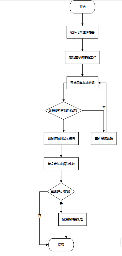 流程图详细展示了读取车速数据的步骤,整个过程主要涉及传感器的初始化与车速数据的获取。首先,进行车速传感器的初始化操作,这是整个过程中的首要步骤,相当于对传感器进行一次“重置处理”,确保传感器状态清晰,无任何残留数据干扰即将进行的车速读取。由于本系统设计中使用的是霍尔传感器,识别传感器的过程相对简化。系统通过发送特定的控制指令来启动传感器的工作,无需进行复杂的设备寻址或匹配。