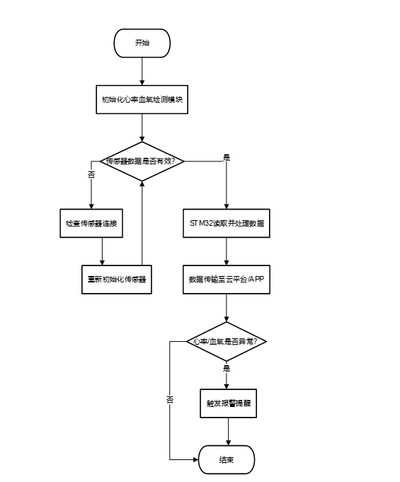 心率血氧检测模块基于MAX30102传感器,通过光电容积脉搏波描记法(PPG)原理实时测量用户的心率和血氧饱和度(SpO2)。系统通过STM32单片机读取传感器的数字输出数据,并进行处理与分析。采集到的数据传输至云平台或移动APP,实现实时监控与记录。当心率或血氧水平异常时,系统将触发报警提醒功能,帮助及时发现潜在健康风险,确保老年人的健康安全。功能模块流程图如下图所示。