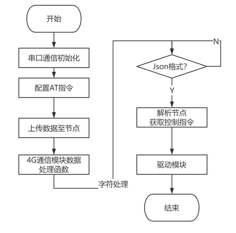 在此系统中,手机与监测设备之间的连接不再依赖WiFi,而是通过4G模块实现。老年人的监测设备通过嵌入式4G模块与云平台或APP进行数据通信。用户只需要在手机上安装相应的APP,并通过4G网络连接到系统。当连接成功后,APP界面会显示设备的IP地址及端口,实时获取来自单片机的数据,如温度、心率、血氧以及摔倒情况等信息。4G模块将数据从监测设备传输到云端,并在APP中展示给家属或护理人员。4G模块连接流程图如下图所示