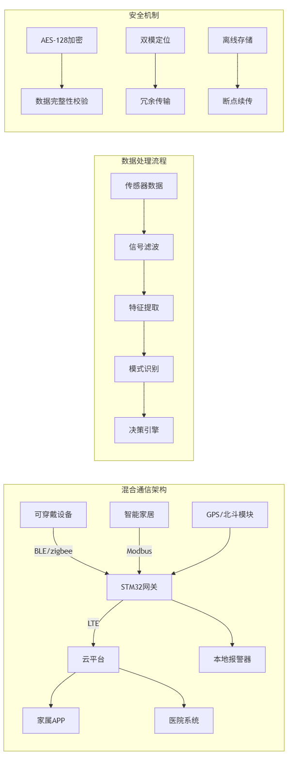 系统采用AES-128加密技术保障数据传输的安全性,并通过双模定位(GPS/北斗)提供精准的定位服务。为了提高数据可靠性,系统采用冗余传输与离线存储,确保在网络不稳定或断网情况下数据不丢失,并支持断点续传功能。在数据处理方面,系统对传感器采集的数据进行信号滤波和特征提取,并使用模式识别算法进行健康评估。当检测到异常时,系统会通过本地报警器、家属APP或医院系统及时通知相关人员采取紧急措施。
