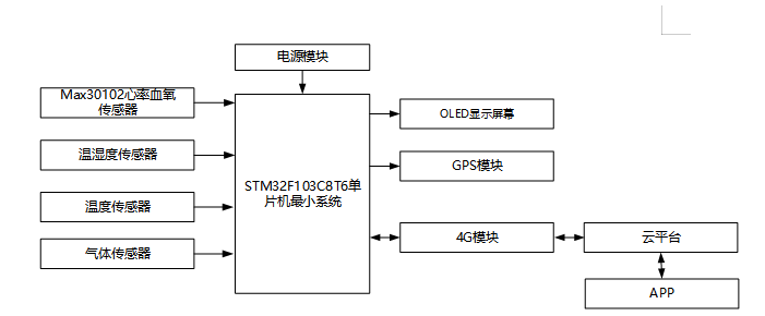 本系统采用STM32单片机作为核心控制单元,结合心率、血氧、体温、加速度传感器等多种高精度传感器,实时监测老年人的生命体征。通过4G通信模块,系统将采集到的健康数据实时上传至APP,家属和护理人员可以通过移动应用或云平台随时查看老人的健康状况。该系统不仅能及时获取老人的心率、血氧、体温等关键健康信息,还能监测其运动状态和环境变化,确保在发生异常时及时报警并采取必要的措施。系统设计充分考虑了老年人的居家安全,提供了高效的数据传输与可靠的健康管理功能,能够为老年人提供全方位的健康保障。如下图所示。