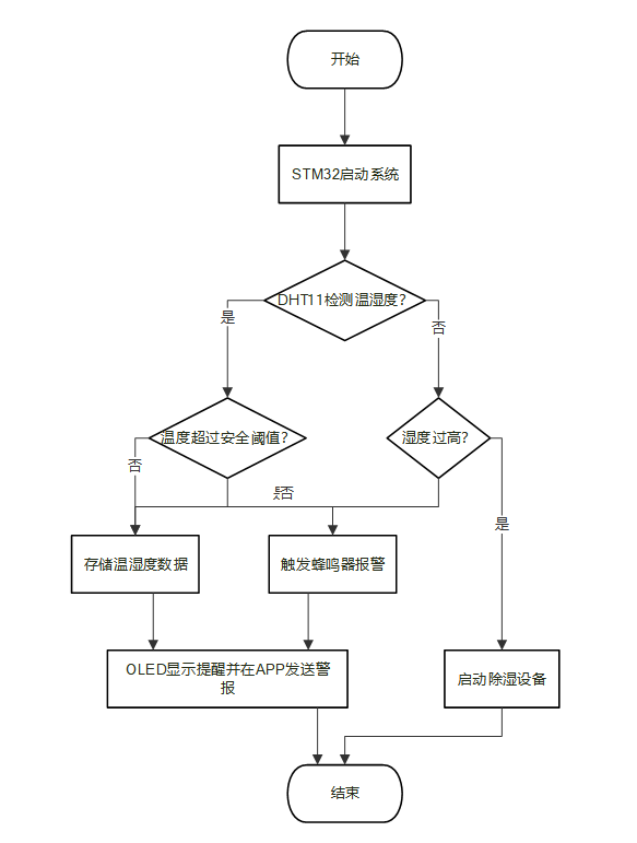 在基于STM32的智能家庭厨房安防系统中,DHT11温湿度传感器用于实时检测厨房环境的温度和湿度,以确保安全与舒适度。DHT11传感器通过其内部集成的电阻式感湿元件和NTC测温元件,将环境温湿度数据转换为数字信号,并通过单总线协议与STM32单片机进行通信。当系统启动后,STM32会周期性地读取DHT11的数据,并对温湿度信息进行分析和存储。如果检测到温度超过设定的安全阈值,系统将触发蜂鸣器报警,并通过OLED显示屏提醒用户,同时在APP上发送警报通知,以便用户采取适当措施,如开启排风扇或调整室内通风条件。同样,当湿度过高时,系统可自动启动除湿设备,减少厨房湿气堆积,防止霉菌滋生。温湿度检测流程如图4-5所示。