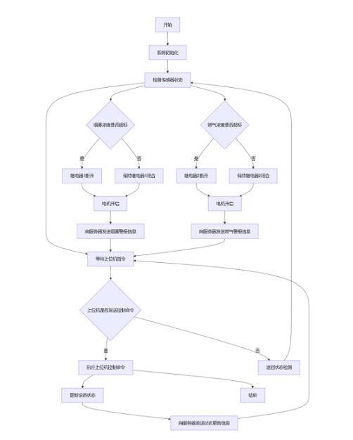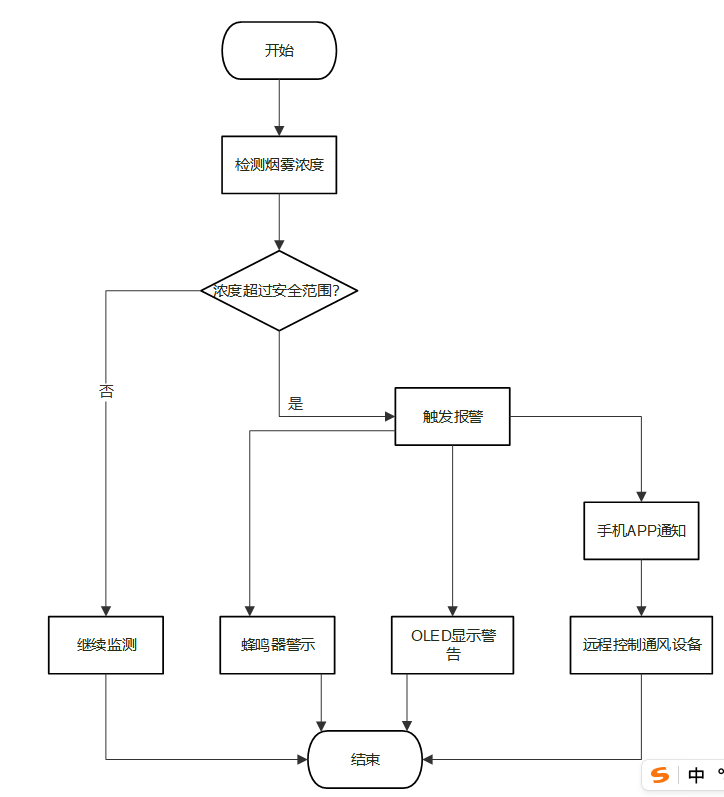 系统集成了烟雾传感器模块,以检测厨房环境中的烟雾浓度。当系统检测到烟雾浓度超过安全范围时,会自动触发报警,蜂鸣器发出警示音,同时在OLED屏幕上显示警告信息。用户可以通过手机APP接收到警报通知,并远程控制通风设备,降低厨房烟雾浓度。若长时间未处理,系统还可自动启动排风扇,加速烟雾排散,确保厨房空气质量。烟雾检测流程如图4-3所示。