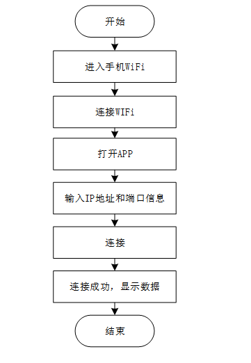 手机上打开WiFi,找到相应WiFi进行连接,连接成功后,进入到APP中,界面中显示IP地址和端口,点击链接,显示链接成功后,界面中显示单片机检测的相关传感器等信息。手机WiFi连接流程图如图4-4所示