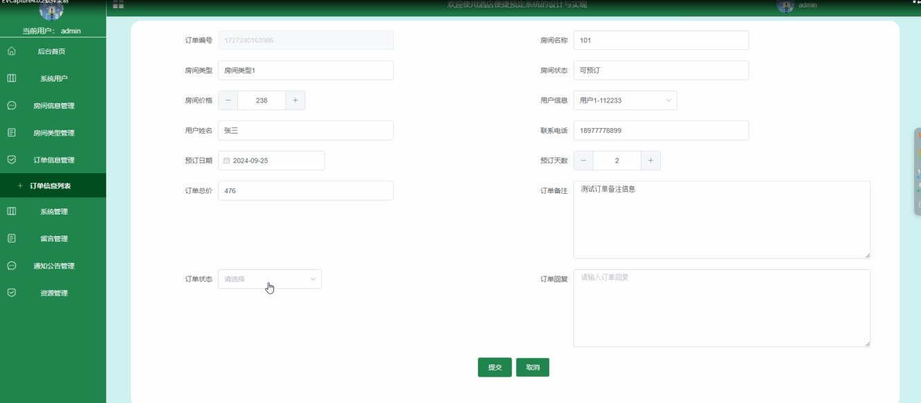 房间信息管理:管理员可查看添加房源信息,修改订单状态,如预订失败、预订成功、已入住、已退房等。