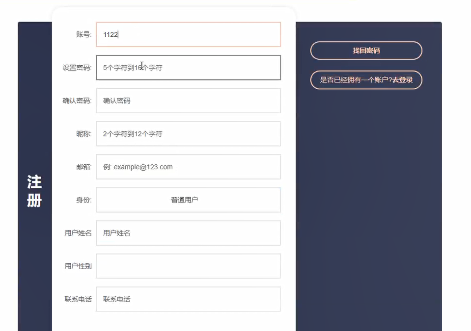 (1)用户注册:浏览用户注册:在用户注册页面中填写好账号、设置密码、确认密码、昵称、邮箱、选择身份、用户姓名、性别等字段值,点击下方注册按钮,提示注册成功后,系统将自动跳转回到首页。