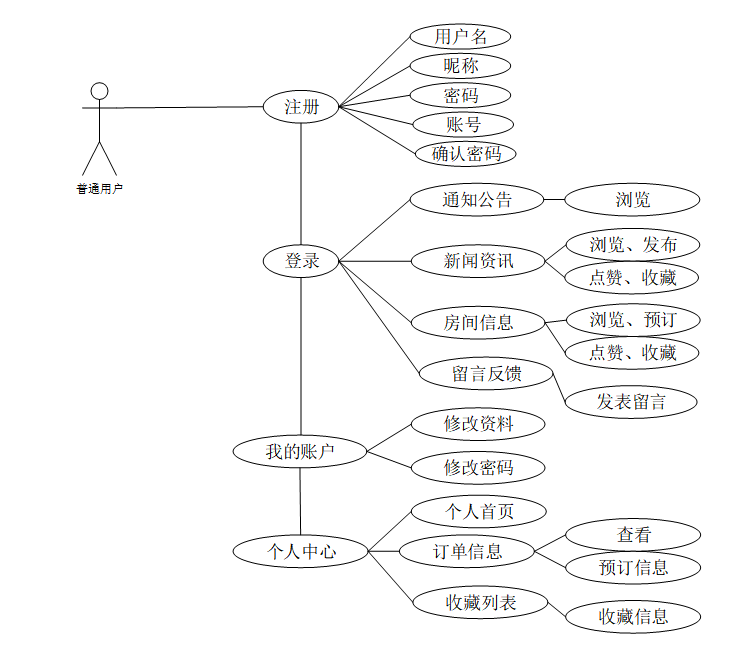 基于酒店便捷预定系统的设计与实现用例分析主要从普通用户,管理员这些实体展开描述。