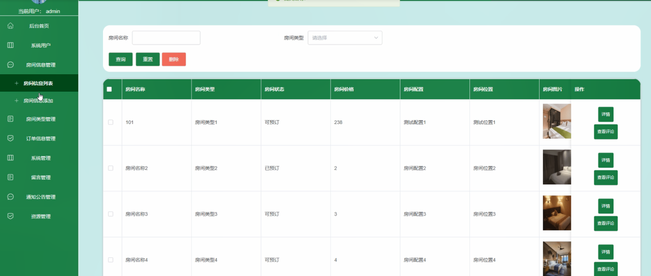 (4)房间类型管理:主要展示房间类型列表,可进行查询、重置查询、删除记录、查看详情等操作。
