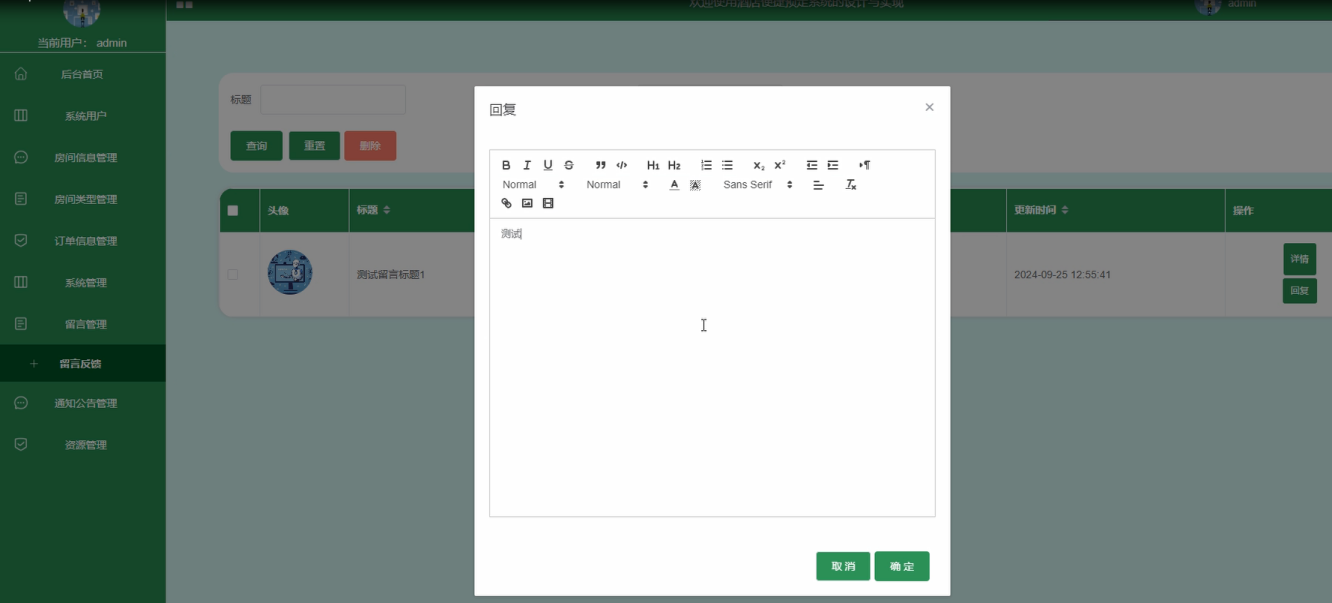 留言管理:管理员可以对用户留言进行查看回复等操作。