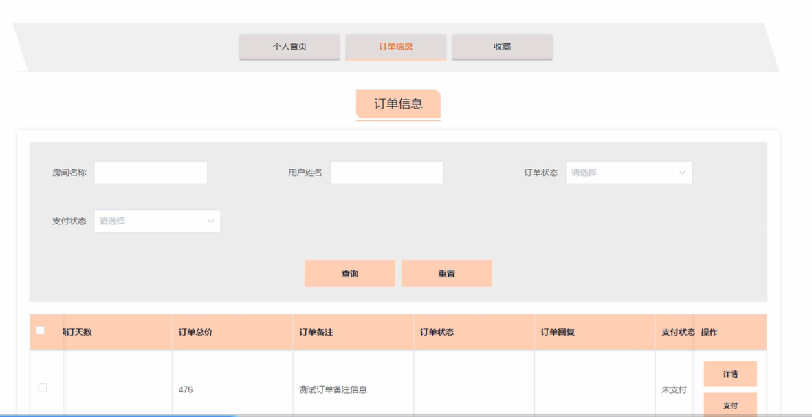 (4)个人中心:包含个人首页、订单信息、收藏列表等。订单信息:查看订单列表,可查看订单详情、可申请换房、支付订单等操作。收藏:查看收藏信息。