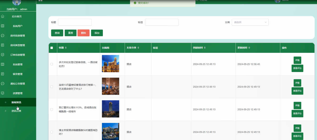 (8)资源管理:包含酒店资讯跟资讯分类,酒店资讯可查看资讯详情与评论,以及查询、重置、删除、添加等操作。资讯分类:可查看资讯分类详情,以及查询、重置、删除、添加等操作。