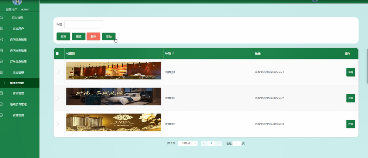 (5)系统管理:轮播图管理:可以查看轮播图详情,以及查询、重置、删除、添加等操作。