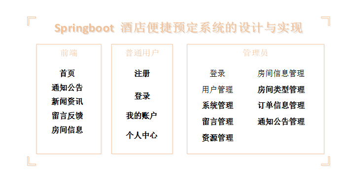 SPRINGBOOT度假酒店管理系统包含前端跟后端,其中还后端包含普通用户、 管理员两个角色划分,主要功能如下:
