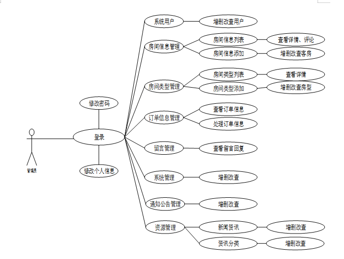 管理员具备系统用户、房间信息管理、房间类型管理、订单信息管理、系统管理、留言管理、通知公告管理、资源管理等需求用例。详细用例图如图2-3所示。