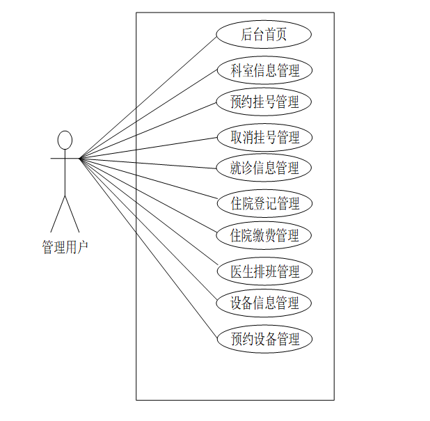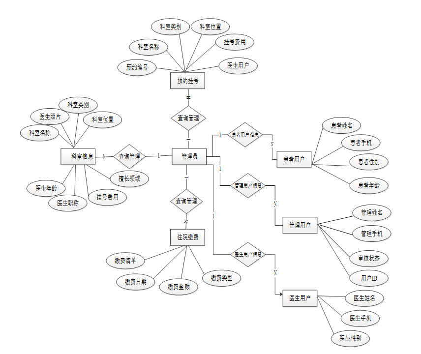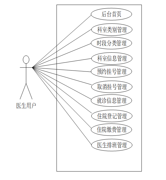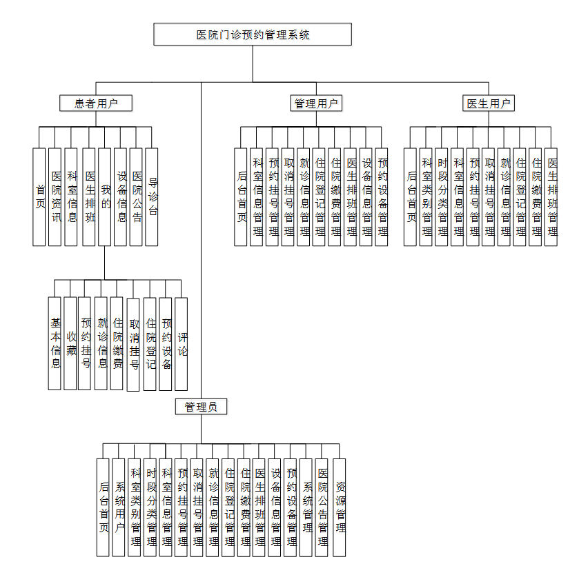 医院门诊预约管理系统划分为了患者用户模块、管理员模块、医生用户模块和管理用户模块这四大部分。