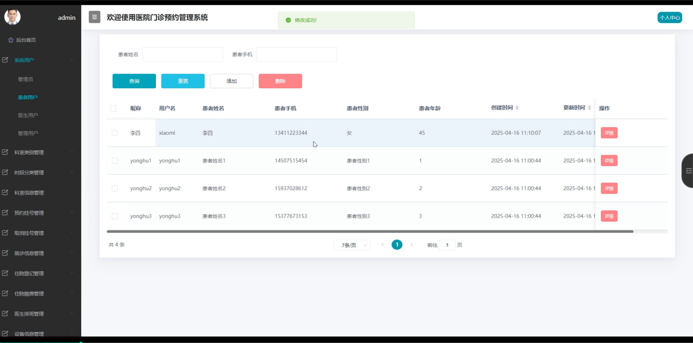 在科室信息管理模块中,管理员可以查看和编辑科室的详细信息,如科室名称 、
