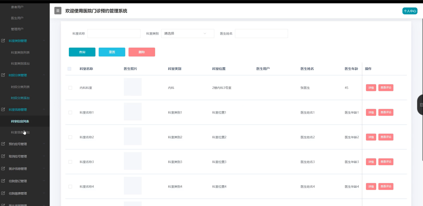 医生照片、科室类别、科室位置、医生用户、医生姓名、医生年龄等。管理员还可以对科室进行增删改操作,确保医院的科室信息始终保持最新状态。界面如下图所示。