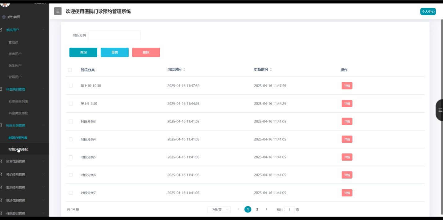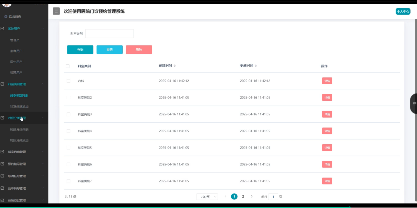 时段分类管理功能使管理员可以设置并管理不同的预约时段,包括早上、下午、晚上的就诊时段。管理员可以为每个时段分配不同的医生和科室,调整时段的开放与关闭,以优化医院资源的使用和患者的就诊体验。界面如下图所示。