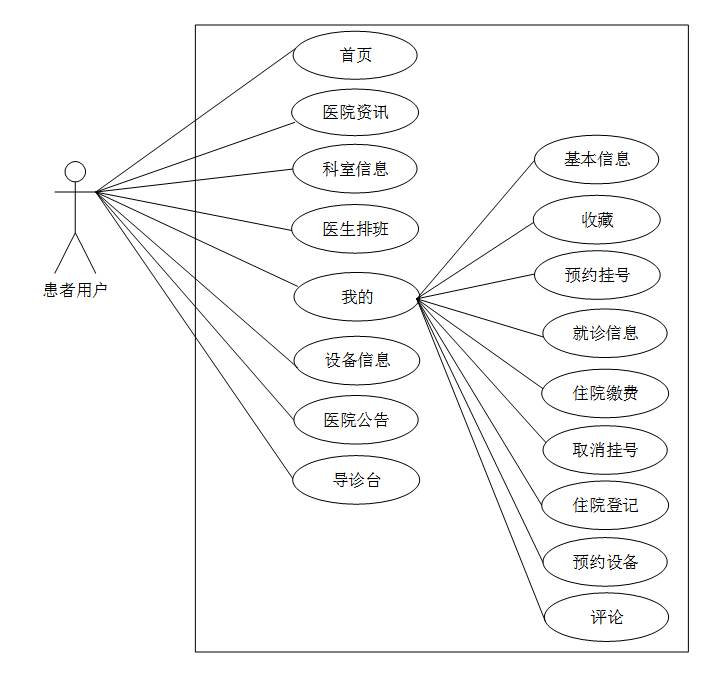 我的:包括患者的个人信息、收藏记录、预约挂号、就诊信息、住院缴费、取消挂号、住院登记、预约设备和评论等。