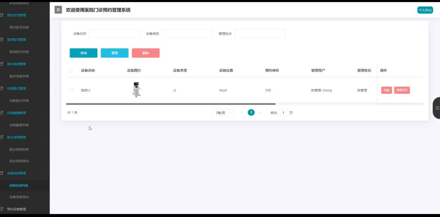 管理用户可以查看医院所有设备的详细信息,如设备名称、设备图片、设备类型、设备位置、预约单价、管理用户、管理姓名等。管理用户可以查看设备的维护记录,并根据设备状态安排维护或修理。界面如下图所示。