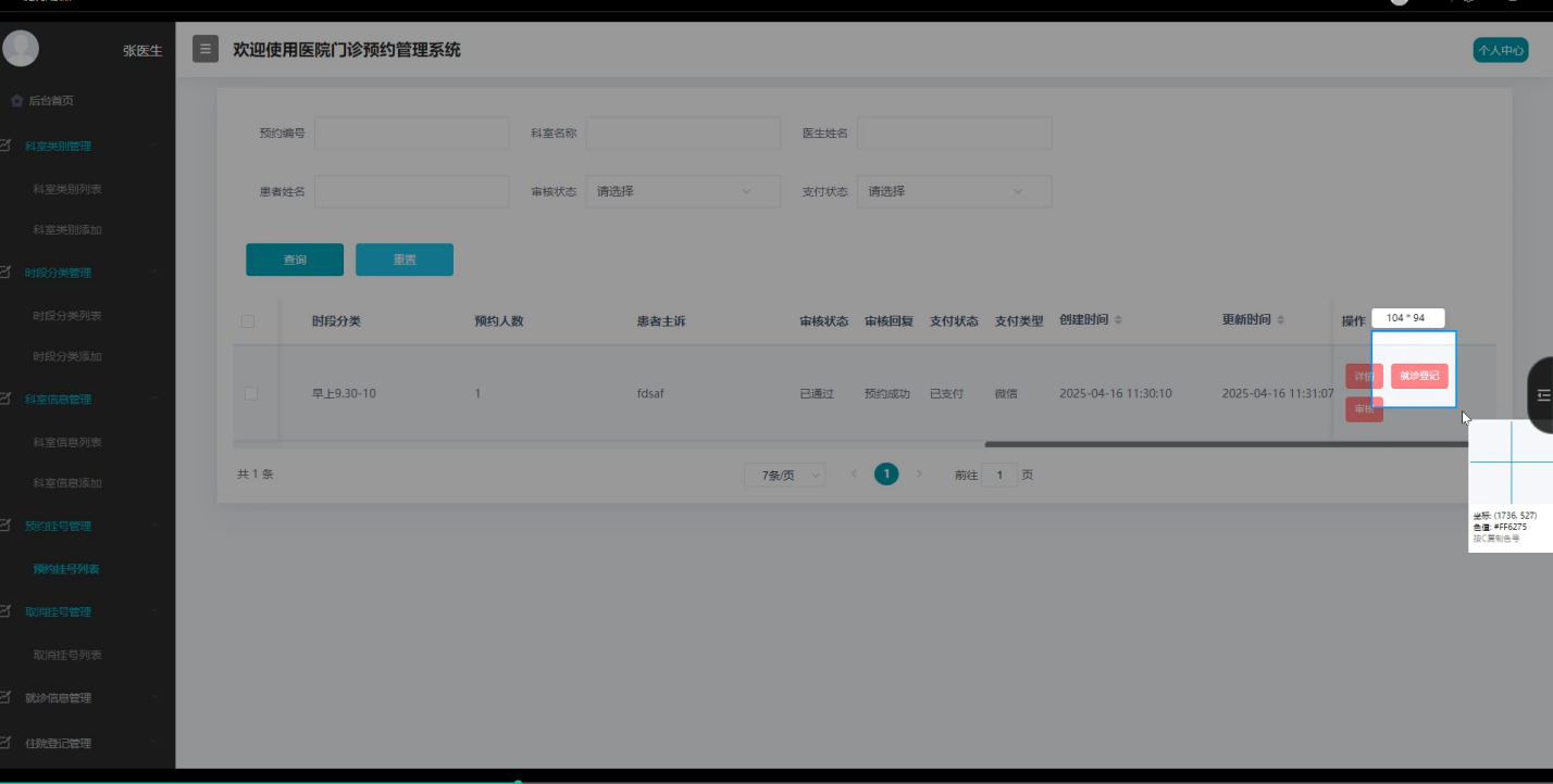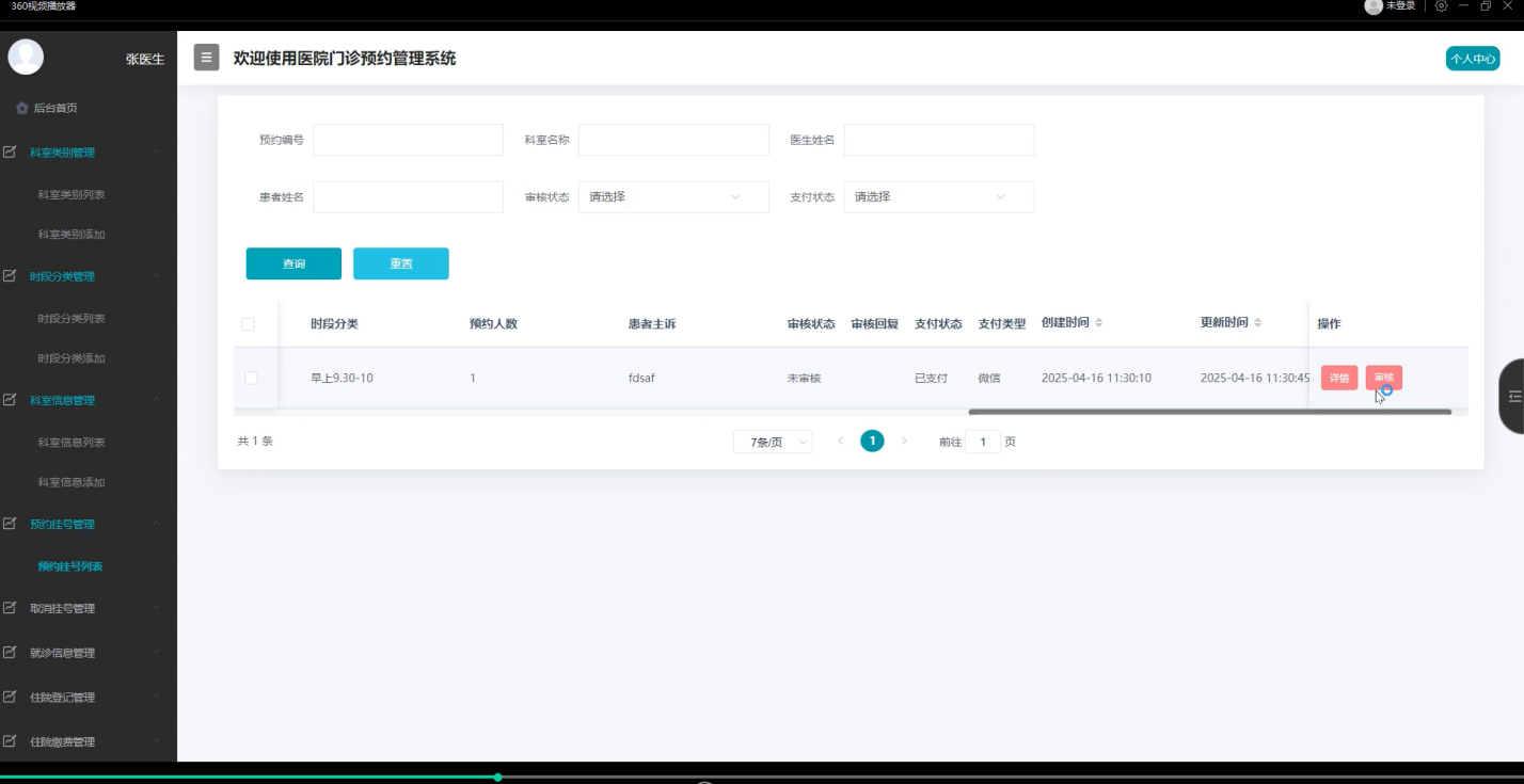 医生可以查看预约挂号的患者信息,包括患者的姓名、联系方式、预约的科室、预约时间等。根据挂号情况调整工作安排,合理分配时间给不同患者。审核患者的预约挂号,查看患者是否按时到诊、是否需要重新安排等。界面如下图所示。