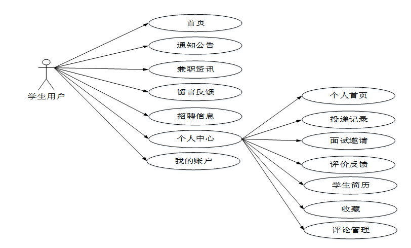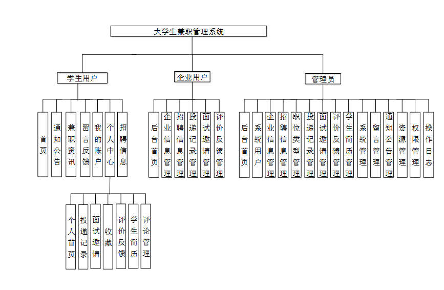 本大学生兼职管理系统设计分为三个主要用户角色:学生用户、企业用户和管理员。以下是对每个角色的功能需求的详细描述。