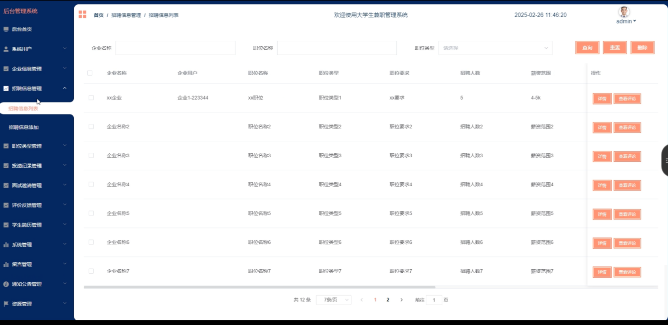 招聘信息管理:企业可以发布、编辑、删除招聘信息,包括兼职岗位的详细描述、薪资待遇和工作地点等。