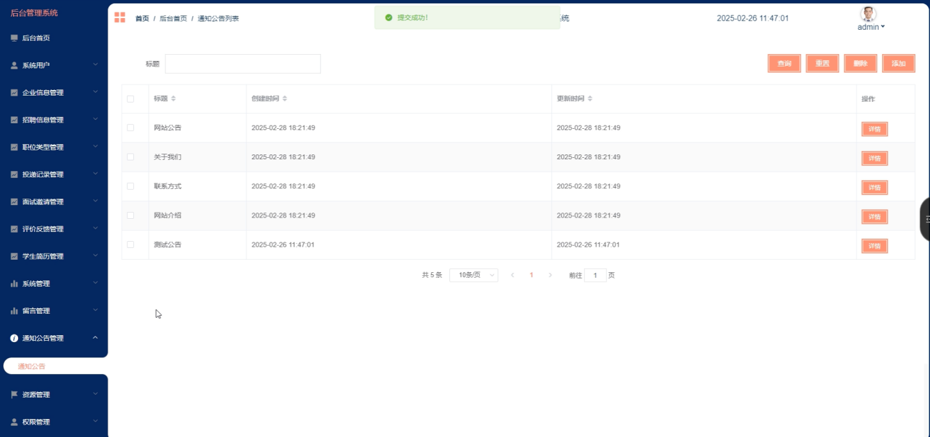 投递记录管理:管理员可以查看所有学生投递的记录,方便对招聘信息进行跟踪和分析。