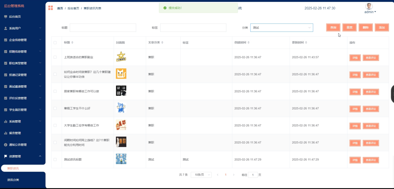 资源管理(兼职资讯、资讯分类):管理员可以管理平台上的兼职资讯和资讯分类,为用户提供有价值的信息。