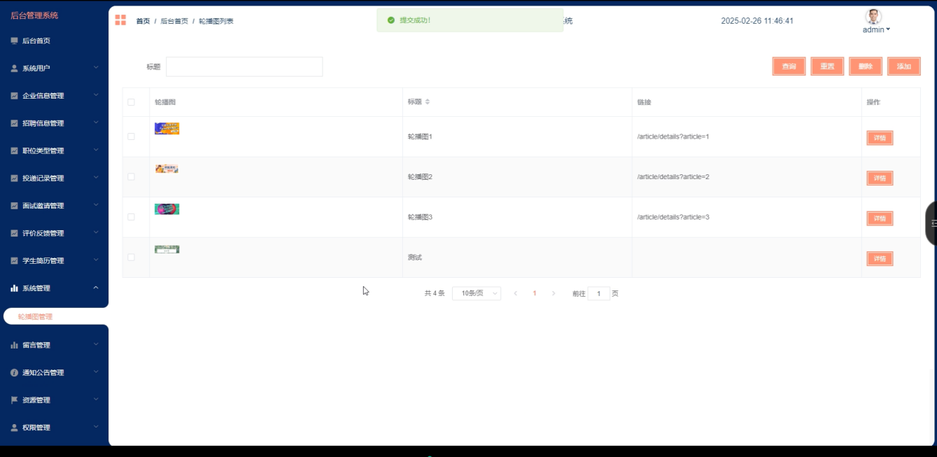 系统管理(轮播图):管理员可以管理首页的轮播图,发布系统公告和推广信息。