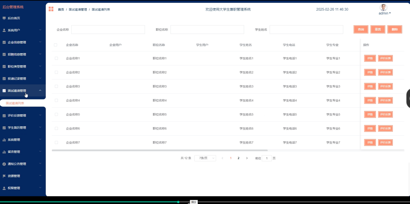 面试邀请管理:企业可以通过系统向合适的学生发送面试邀请,安排面试的时间和地点。