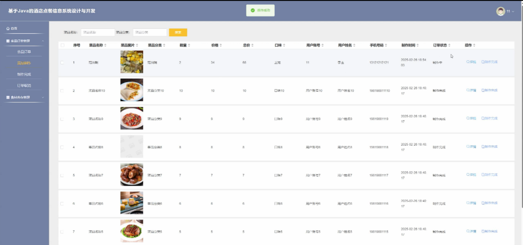 菜品订单管理(含菜品制作、制作完成、上菜信息、订单取消):管理员可以全面监控订单处理流程,从接收订单到菜品上桌的每一步,处理异常情况,确保订单顺利执行。