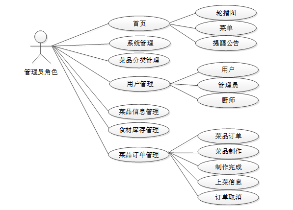 springboot基于Java的酒店点餐信息系统中管理员包含登录、后台首页、系统管理(轮播图、菜单、提醒公告)、用户管理(用户、管理员、厨师)、菜品分类管理、菜品信息管理、菜品订单管理(菜品订单、菜品制作、制作完成、上菜信息、订单取消)、食材库存管理等功能。管理员用例图如下所示: