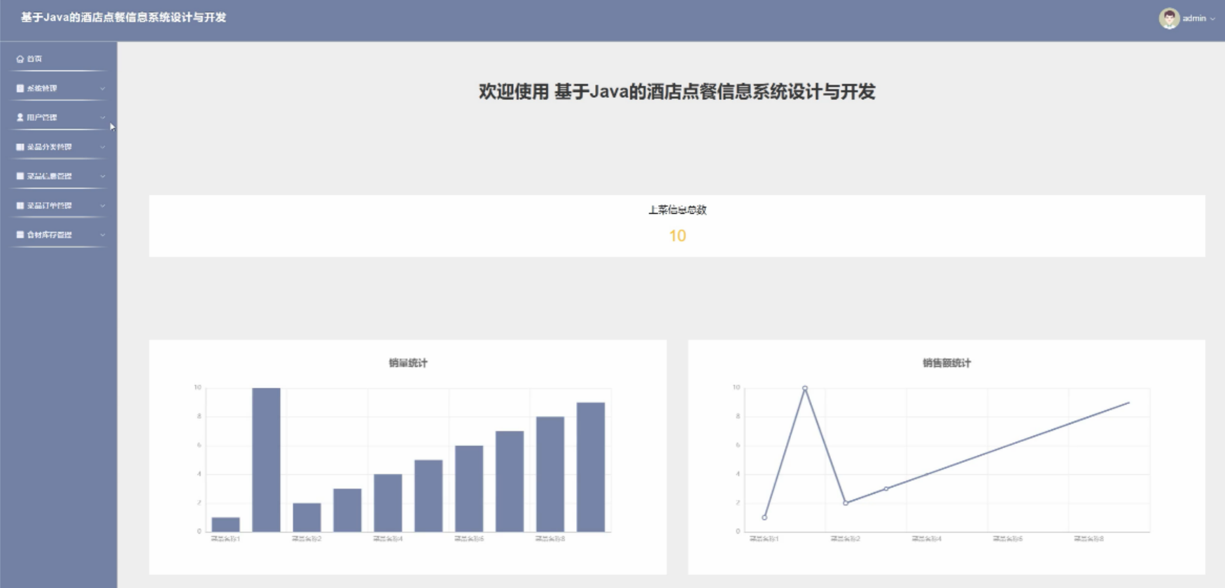 首页:管理员首页汇总了系统的关键数据,如订单量、用户活跃度、食材库存状况等,帮助管理员快速了解系统整体运行状况。