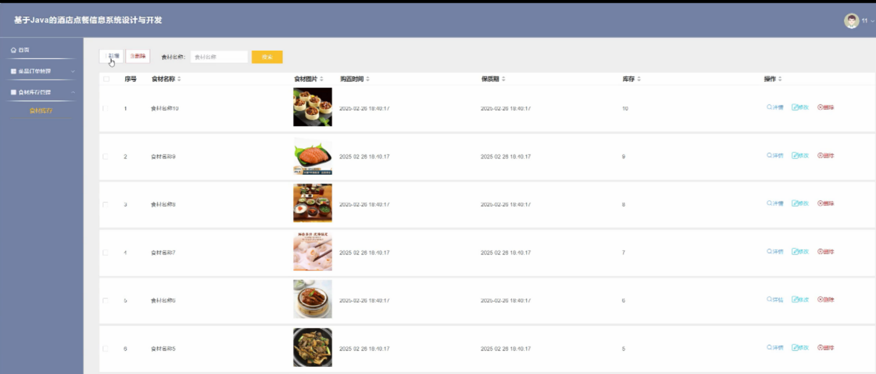 食材库存管理:管理员通过此功能全面管理食材库存,包括库存盘点、补货提醒、过期预警等,保障厨房运作的高效性和食材的新鲜度。